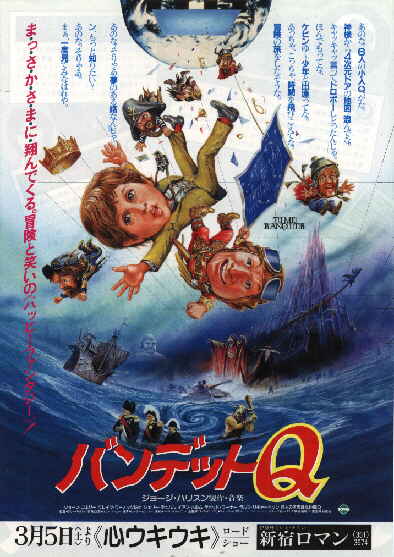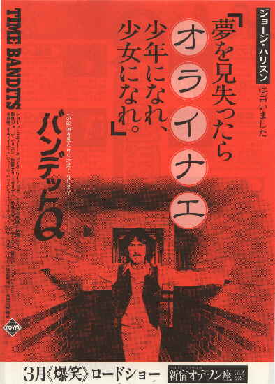 この映画、ハンドメイドフィルムスというジョージハリソンがモンティの為に作った映画会社の制作で、主題歌と制作もジョージハリソンだったんです。あとちょっとした役でショーンコネリーが出ている。宣伝でも見事、ショーンコネリーやジョージハリソンが一番大きくのってました(笑)。ちらしは2種類あったんですが、通常版は普通のものでこちら。あともう1種類がこちら。見てもらえばわかりますけど、ジョージハリスン大特集って感じで何が何だかわかりません。もちろんジョージはでやしないのに。しかもキャッチコピーの「オライナエ少年になれ少女になれ」って言われてもねえ(笑)。映画の主題歌の「DREAM A WAY」って曲の邦題が「オ・ラ・イ・ナ・エ」なわけなんですけど、もちろん映画と関係ありません。バンデットQのQもわかんないですよ。6人の小人Qって言われても、なんでQなんだ。